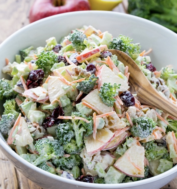 - Combine chopped broccoli, grated carrot, chopped apple, chopped onion, chopped walnut and cranberries.