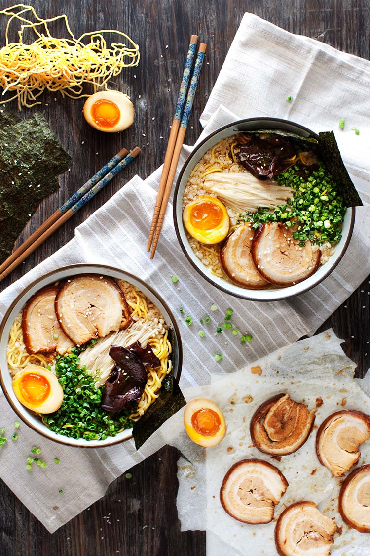 - Arrange the noodles in a bowl and place the chashu, egg, some minced pork fat, your favorite toppings and garnish. Serve immediately.