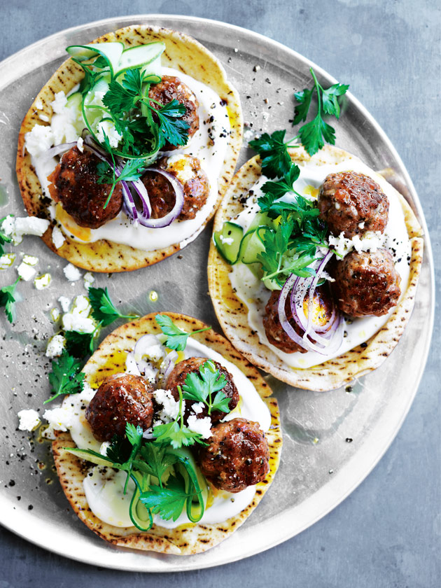 - Top the flatbreads with the yoghurt, meatballs, cucumber, onion, parsley and remaining feta. Sprinkle with pepper to serve. Serves 4.