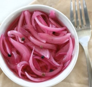 - Once boiling, pour the vinegar over the sliced onion and garlic*. Press the onion down so all the pieces are submerged, then let the mixture cool to room temperature.